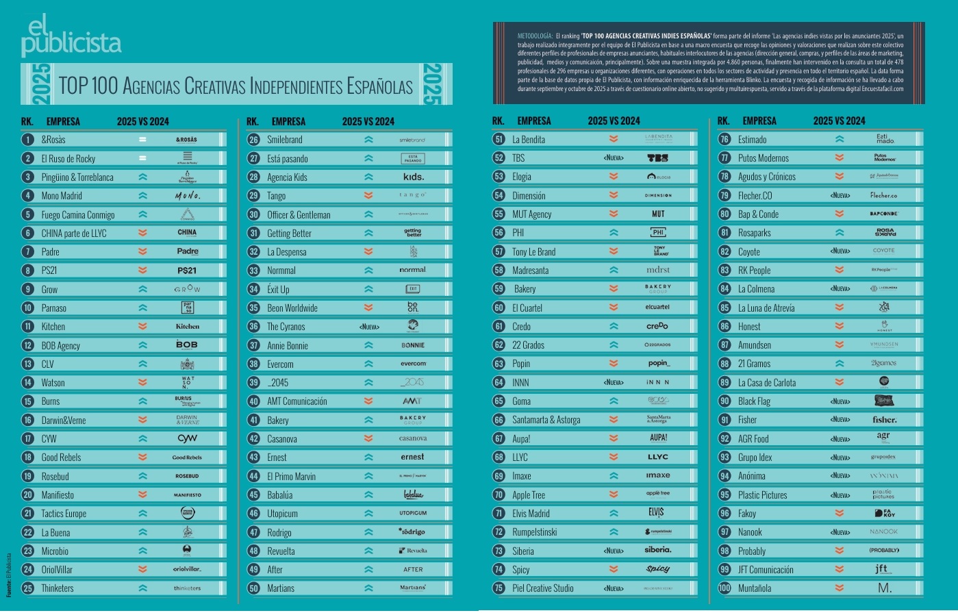 El grupo de cabeza de este año queda completado este año por El ruso de Rocky (igualmente maniene la segunda plaza) y por Pingüino & Torreblanca, que salta a la tercera posición. Mono Madrid y Fuego Camina Conmigo escalan varios puestos respecto al ranking de 2024 para colocarse en cuarta y quinta plaza, respectivamente. Las siguientes posiciones están ocupadas por China by LLYC, Padre, PS21, Grow y Parnaso (estas dos últimas agencias se cuelan en el Top 10 por primera vez en la historia del ranking).