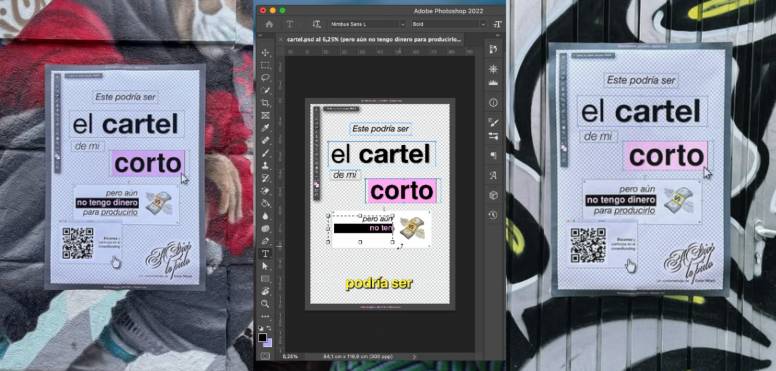 A través de unas gráficas que no han conseguido salir de la interfaz de Photoshop y el titular “Este podría ser el cartel de mi corto, pero todavía no tengo dinero para producirlo” busca reforzar en el mundo físico esa ayuda que ya ha conseguido en el universo digital. Escaneando el código QR de estos carteles, cualquier persona puede acceder al crowdfunding y aportar para hacer posible la producción (y su futura campaña de cartelería).