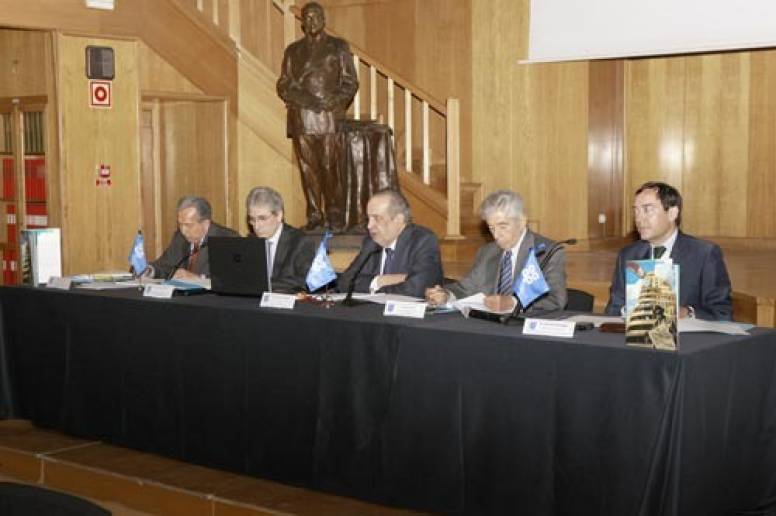 En la fotografía Juan Carlos Falantes se dirige a los asociados flanqueado, de izquierda a derecha, por el director del Departamento de Asuntos Financieros, Francisco Centeno; el secretario general, José Antonio Lombardo; el vicepresidente, Augusto Macías y el director del Departamento de Asuntos Jurídicos y Laborales, José de Cominges.