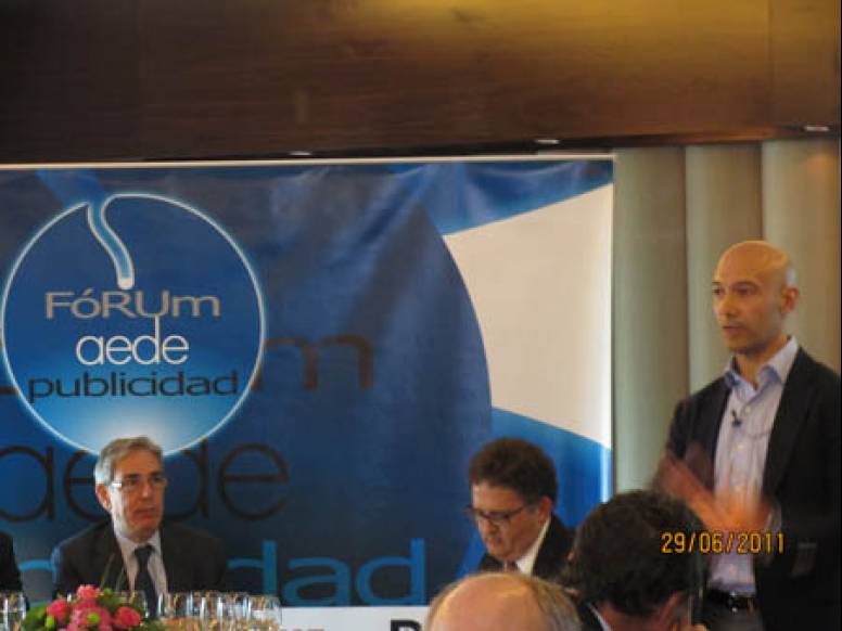 En la foto, de izquierda a derecha, en la mesa, Antonio Fernández Galiano, presidente de aede y José María Rull, consejero delegado de DDB, y de pie Eduardo Fernández Rojo.