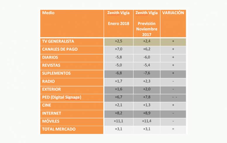 La inversión publicitaria en 2018 podría crecer un 3,1% en 2018, según los panelistas de Zenith Vigía, compuesto por directivos de medios de comunicación y coordinado por Eduardo Madinaveitia, director de recursos técnicos de Zenith. “Tras cerrar un 2017 prácticamente plano, se espera que en el año que comienza el mercado publicitario reaccione y aproveche el viento a favor de la recuperación económica y del consumo”, afirma Madinaveitia, quien añade que “durante este año se celebrará un Campeonato Mundial de Fútbol, un evento que habitualmente tiene una repercusión positiva en el sector. Además no se espera que haya convocatorias electorales importantes, que suelen tener un efecto negativo en la inversión”.