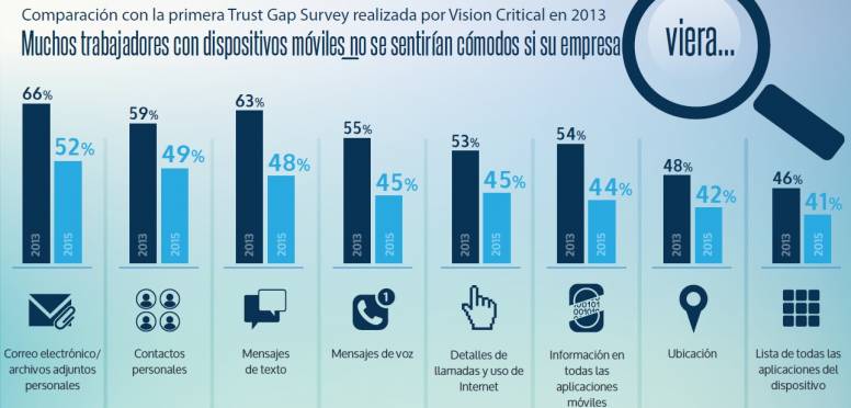 De hecho, en comparación con la primera Trust Gap Survey realizada en 2013 por Vision Critical, los empleados móviles no se sienten cómodos sabiendo que su empresa pueda tener acceso a información personal como E-mails y archivos adjuntos personales (52% frente al 14%); contactos personales (49% frente al 10%); textos/mensajes instantáneos ( 48% frente al 15%); correos de voz (45% frente al 10%); detalles de llamadas de teléfono y uso de Internet (45% frente al 8%); la información en todas las aplicaciones móviles de su dispositivo (44% frente al 10%); sobre localización (42% frente al 6%) o sobre su lista de todas las aplicaciones en el dispositivo (41% frente al 5%).