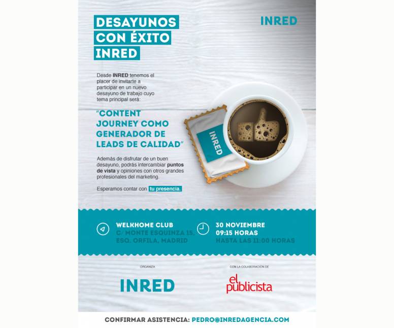 INRED, la primera red de agencias regionales independientes de España, continúa con sus desayunos de trabajo con anunciantes y el próximo 30 de noviembre analizará el “Content Journey como generador de leads de calidad”. Tras la presentación de Pedro Montero, director general de INRED, los responsables de INRED Cataluña, Angel Pardo, director de innovación, y Angel Vila, responsable de métricas, abordarán este tema tan candente en la actualidad y de gran interés para los anunciantes.