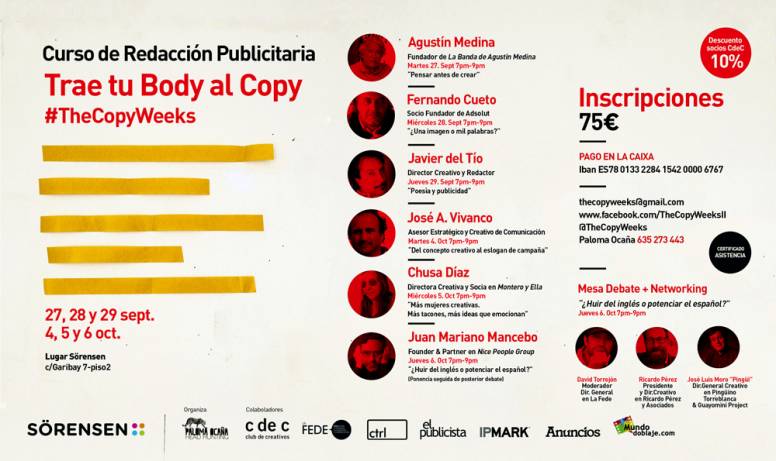 Los días 27, 28 y 29 de septiembre y 4,5 y 6 de octubre tendrá lugar la segunda edición de The Copy Weeks, organizada por Paloma Ocaña Headhunting con la colaboración de la agencia de eventos Sörensen. Esta nueva edición, que se celebrará en las oficinas de Sörensen, volverá a reunir a algunos de los creativos y redactores más representativos de la publicidad española de las últimas cinco décadas. Durante seis días, Agustín Medina, Fernando Cueto, José Antonio Vivancos, Javier del Tío, Chusa Díaz y Juan Mariano Mancebo desvelarán los secretos del copywriting y de la creatividad en general. Este año, además, The Copy Weeks finalizará con una interesante mesa de debate que, con el título "¿Huir del inglés o potenciar el español?", tratará de arrojar algo de luz sobre una cuestión tan polémica como es el uso de extrajerismos en la publicidad. En este debate contaremos con la presencia de otros dos grandes creativos, Jose Luis Moro y Ricardo Pérez, y con la labor moderadora de David Torrejón, director general de La Fede.