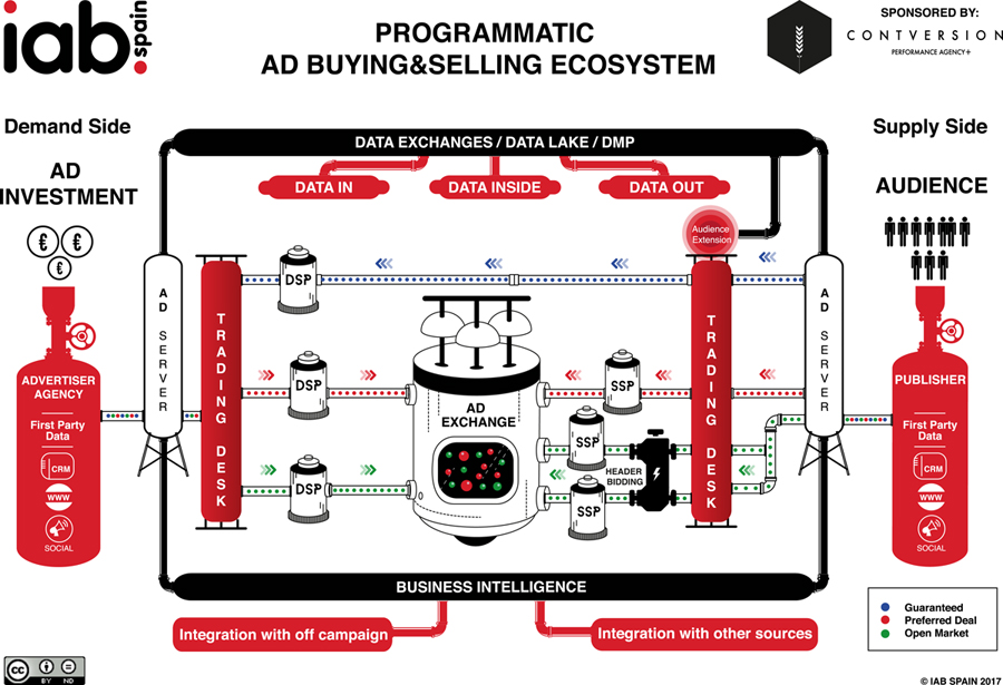Este documento pretende recoger de manera gráfica y visual los flujos de trabajo tanto desde el punto de vista de la inversión (anunciante) como desde el punto de vista de la audiencia (soporte), teniendo en cuenta las capas transversales de datos (data exchanges, data lake o DMP) y de business intelligence. Además de los modelos de compra programática (guaranteed, preferred deal, open market).