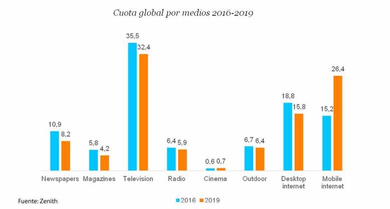 Distinguimos entre la televisión y la publicidad en video online porque se distribuyen de forma diferente, generalmente se venden de manera diferente y se categorizan de manera diferente por organismos que supervisan la inversión publicitaria. Pero para muchos consumidores están empezando a difuminarse las diferencias ya que los smart TV y otros dispositivos ofrecen acceso al contenido de Internet en los televisores principales de los hogares. Los anunciantes también están descubriendo que tiene cada vez menos sentido planificar la televisión y el video online por separado: funcionan mejor como complementos que como sustitutos. La televisión aporta el alcance, mientras que la ventaja de los videos online es la segmentación y la personalización. Juntos se están volviendo más importantes que nunca para los anunciantes que buscan construir marca. Excluyendo clasificados y buscadores, que son canales de respuesta directa, la televisión y el vídeo online representaron el 48,5% de la inversión publicitaria de marca en 2016, frente al 43,7% de 2010, y se prevé que su cuota de mercado aumentará al 49,3% en 2019.