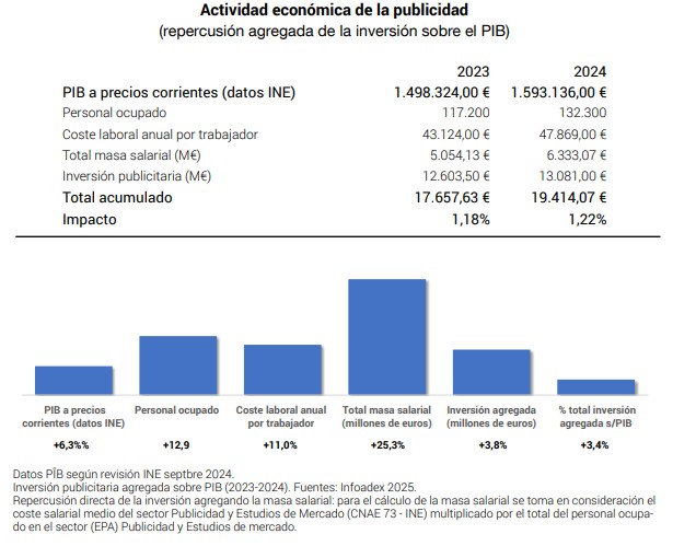 Con este avance, la repercusión agregada de la inversión publicitaria sobre el PIB llegó al 1,22%, una décima más que en 2023, apoyada también en el aumento del coste laboral medio y de la masa salarial del sector.