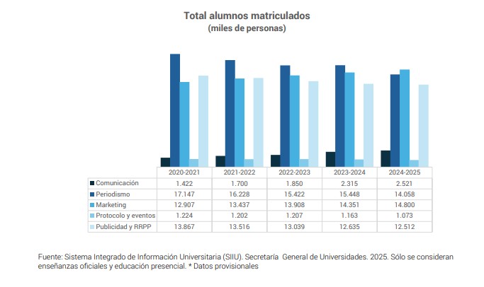 En el ámbito educativo, el Observatorio identifica una clara divergencia entre disciplinas. Marketing es el área con mayor crecimiento, con un 3,1% más de matriculados y un total de 14.800 estudiantes. Publicidad y relaciones públicas cae ligeramente a 12.512 alumnos, mientras comunicación aumenta hasta 2.521.
