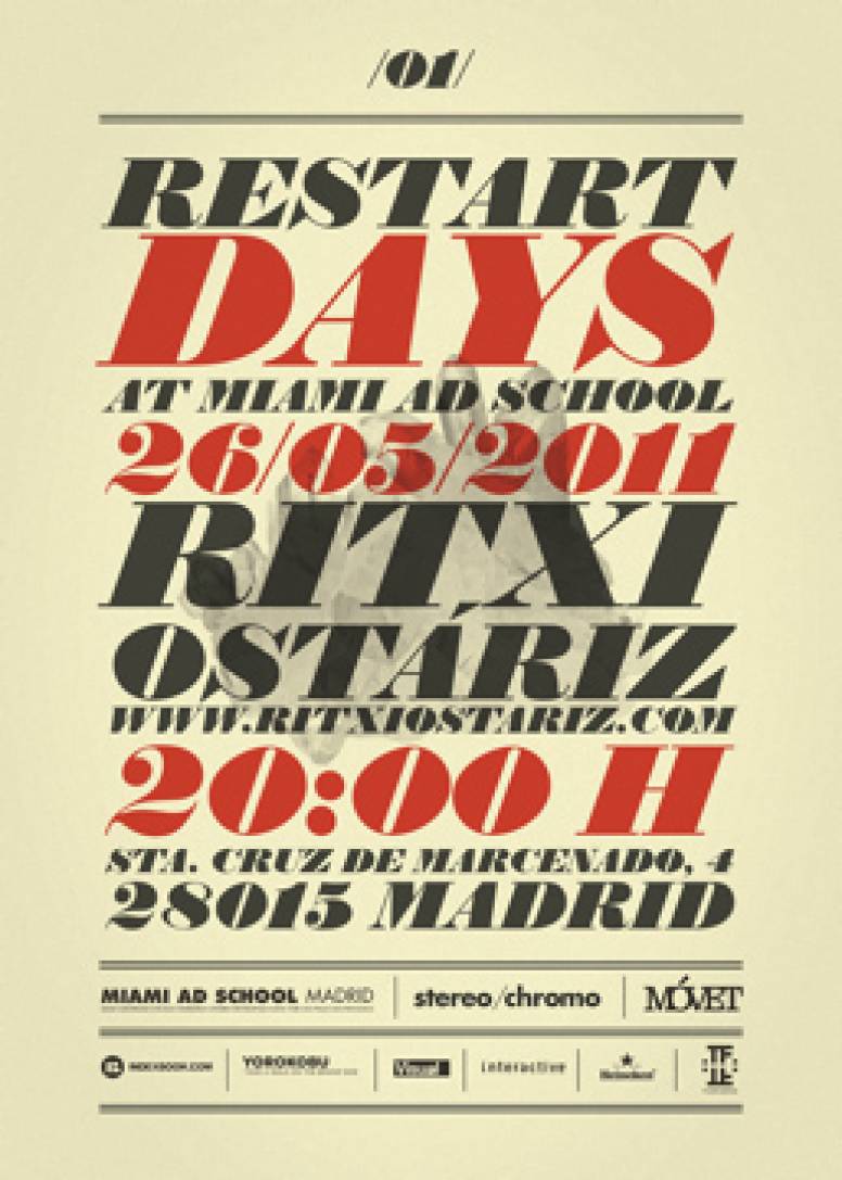 El diseñador bilbaíno Ritxi Ostáriz ha visitado el Miami Ad School Madrid como participante en el proyecto Re.start days. Durante la charla, Ostáriz, repasó sus proyectos profesionales más importantes y hubo tiempo también para conocer algunas anécdotas y curiosidades de su trabajo como diseñador.
