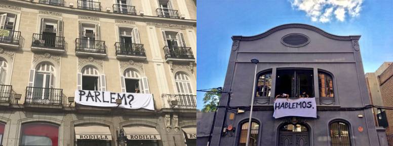 Una pancarta desplegada en el balcón de la sede de Sra. Rushmore, con el texto “Parlem?”, ha encendido la mecha de una iniciativa que pide diálogo ante la delicada situación planteada con ocasión del referéndum independentista convocado para este domingo día 1 de octubre en Cataluña. La agencia madrileña lanzaba ayer el mensaje “desde Madrid a Cataluña” y poco después, en la fachada de SCPF en Barcelona se exhibía, en respuesta, otra pancarta con el lema “Hablemos”.