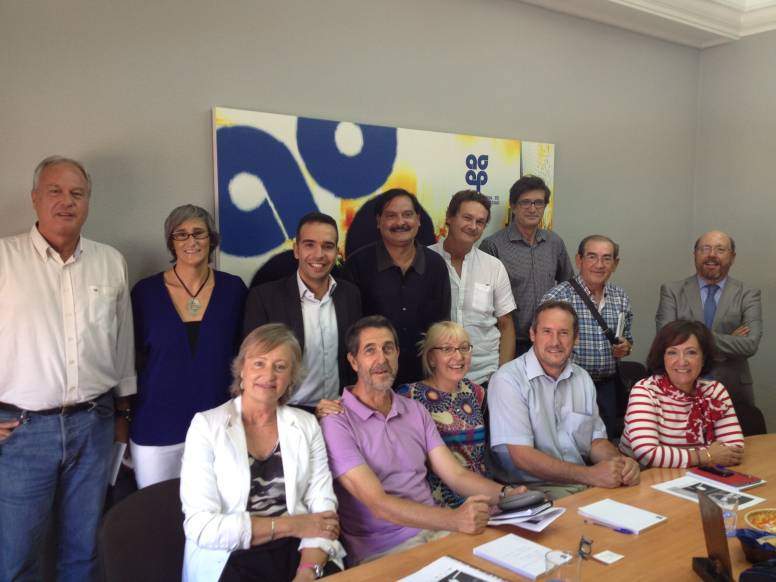 La fotografía recoge la presentación de Storytelling en la Federación Nacional de Empresas de Publicidad en Madrid por su presidente, Ángel del Pino; el presidente de la Academia de la Publicidad, Fernando Herrero; el director del congreso, Richard Wakefield, Reyes Ferrer, y el vicepresidente de la comarca del Cinca Medio, Jesús Guerrero, acompañados por representantes de medios colaboradores.