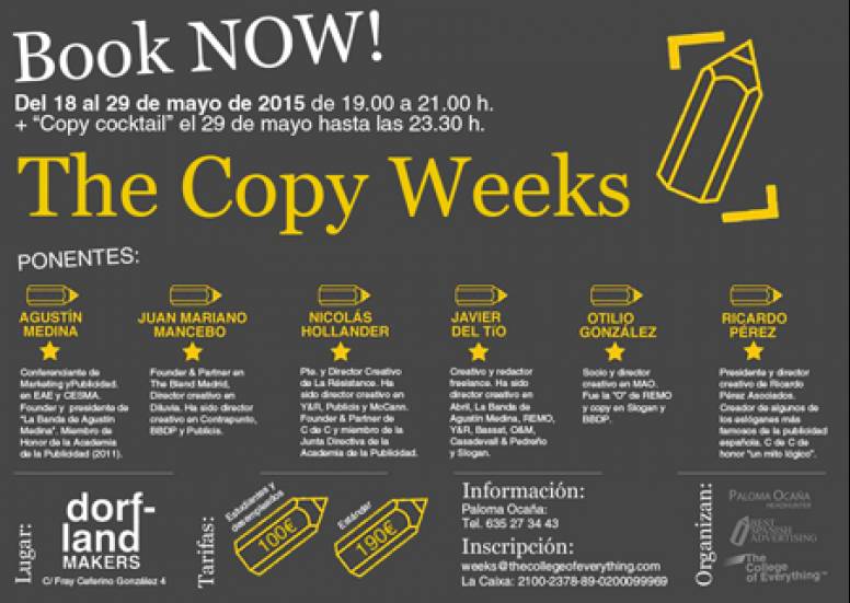 The College of Everything y Paloma Ocaña Headhunting han organizado entre los días 18 y 29 de mayo “The Copy Weeks”, un ciclo de talleres que reunirá a algunos de los copys más famosos de la publicidad española.