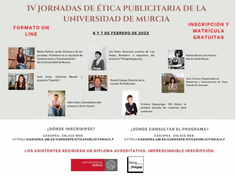 La Universidad de Murcia, bajo la dirección de Maite Pellicer, profesora de la Facultad de Comunicación y Documentación, organiza sus IV Jornadas sobre Ética Publicitaria los días 6 y 7 de febrero de 2023, dirigidas a estudiantes de dicha facultad y a público en general interesado en el tema.