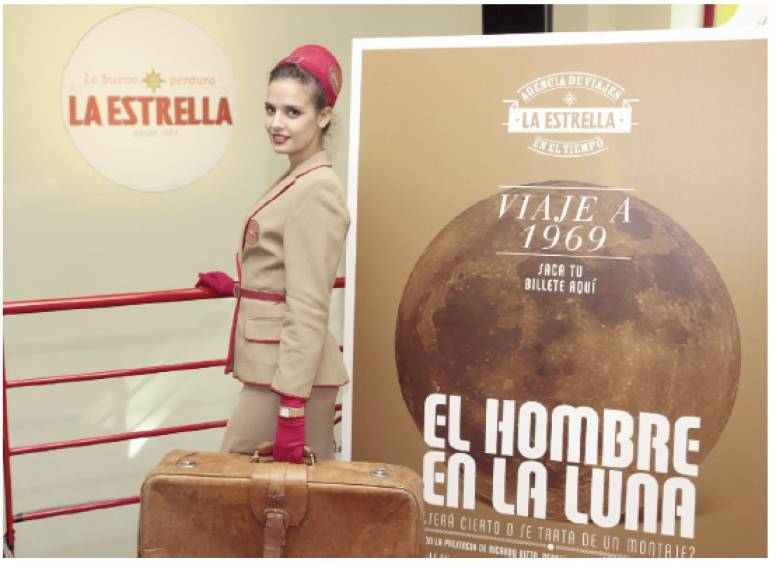 Acción 2: agencia de Viajes en el Tiempo. La «Agencia de Viajes en el Tiempo La Estrella» se instaló durante un mes en un local de la madrileña Plaza de Olavide, en la frontera entre los barrios de Chamberí y Malasaña, y permitía, sin moverse del sitio, hacer grandes tour, miniviajes, viajes en grupo y otras singulares ofertas que convirtieron los recuerdos en algo que se podía tocar, sentir e incluso paladear. Fueron, en total, veinte «viajes» diferentes a través de los cuales la agencia recuperó algunos de los momentos de la historia más reciente vivida por los españoles junto a la marca. La agencia se presentó a los medios con un «viaje» al partido España-Malta de 1983, retransmitido de nuevo por el mismísimo Poli Rincón y José Ángel de la Casa. Otros «viajes en directo» que los consumidores pudieron realizar tras obtener los «billetes» a través de la web de la marca o de la propia agencia fueron el momento en que el hombre pisó la luna –retransmitido por un especialista de la Nasa–, la victoria de Massiel en Eurovisión o el último episodio de Verano azul. También se organizaron cursos y talleres gratuitos de elaboración artesanal de quesos o muñecos, así como diversas charlas, una de ellas, por ejemplo, sobre el diseño que perdura. Tal y como había sucedido con la acción del sereno, la «Agencia de Viajes en el Tiempo» atrajo la atención de numerosos medios de comunicación, además de contribuir a incrementar el tráfico en la web de la marca y la conversación sobre ésta en Facebook y Twitter.