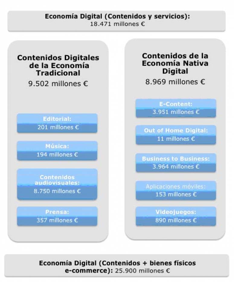 De esta cifra, 9.502millones de euros corresponden a los contenidos digitales de la economía tradicional, destacando por su peso los sectores de la industria audiovisual y la prensa, que registraron unos ingresos de 8.750 y 357 millones de euros, respectivamente. Los contenidos correspondientes a la economía nativa digital generaron unos ingresos de 8.969 millones, gracias al papel de campos tan relevantes como los servicios digitales relacionados con el B2B (3.964 millones de euros), los nuevos negocios basados en el e-content (3.951 millones de euros) y los videojuegos (890 millones de euros), entre otros.