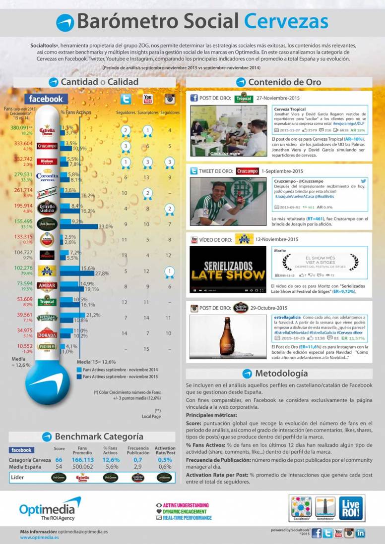 El Barómetro Social de Optimedia es un análisis realizado con Socialtools®, herramienta propietarias del grupo ZenithOptimedia Group, que permite determinar las estrategias sociales más exitosas, los contenidos más relevantes, así como extraer benchmarks y múltiples insights para la gestión social de las marcas en la agencia de medios. Como novedad de esta edición, además de los tradicionales ratios y evoluciones en Facebook, Twitter y Youtube, se ha incluido un análisis de la posición de cada perfil en Instagram, red social de gran relevancia para las marcas por su elevado potencial y extraordinario crecimiento en los últimos tiempos.