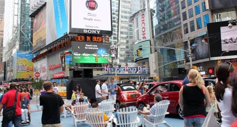 Una campaña a gran escala que genera impacto y ruido (acción viral, por tanto) es lo que se ha sacado de la manga la marca italiana. en realidad la idea va en la misma línea que la galería pop-up que la marca abrió durante el pasado Salón Internacional del Automóvil de Nueva York en abril, aunque da un giro de turca más allá y trata de vincular al ciudadano neoyorkino. Y es que Fiat ha convertido la famosa plaza de Times Square en un cine drive-in ¿cómo?. Pues inundado la plaza con una flota de Fiat 500 y utilizando la pantalla de Fox (situada en la fachada norte del edificio One Times Square) como pantalla de cine. Todo muy americano, pero con un toque glamouroso muy europeo.