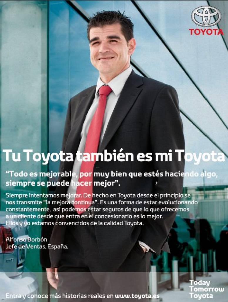 Bajo el claim “Tu Toyota también es mi Toyota”, la campaña (ideada por Saatchi&Saatchi), muestra la "convicción personal, pasión y compromiso de los empleados (algunos españoles) con el fabricante japonés para reforzar la confianza en la marca y el producto". Todos los empleados que aparecen en la campaña forman parte y se identifican como tales, de las plantillas que intervienen en el proceso de los coches, desde su producción hasta el servicio post-venta.