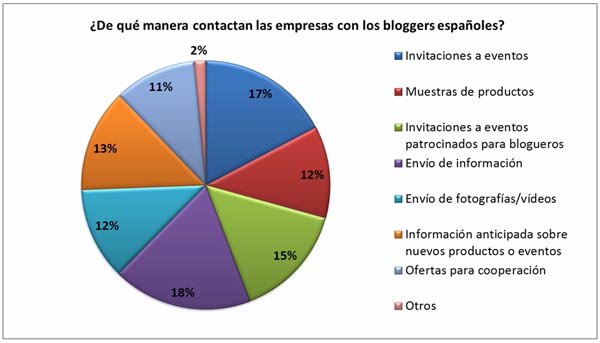 Asimismo, el 32% de los encuestados españoles asegura que las compañías contactan a diario con ellos, mientras que el 26% testifica que lo hacen varias veces a la semana. En Europa los porcentajes son menores: el 17% reconoce que las compañías les contactan a diario mientras que el 14% asegura que lo hacen varias veces a la semana. Gran Bretaña destaca notablemente porque el 74% de los blogueros encuestados afirma que contactan con ellos diariamente.