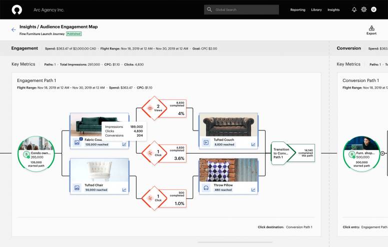 Illumin ofrece así la única solución integral en el mercado, con tres plataformas en una. Fácil de usar: permite arrastrar y colocar audiencias, creatividades y establecer condiciones sobre un canva drag&drop. Y es altamente intuitiva: se visualiza cómo los anuncios sociales impactan en la estrategia de campaña, y permite exportar y compartir el canva del Journey de Illumin y sus insights.