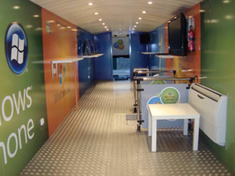 Saca a la calle un autobús corporativo para promocionar el nuevo sistema operativo. En la imagen, interior del autobús promocional.