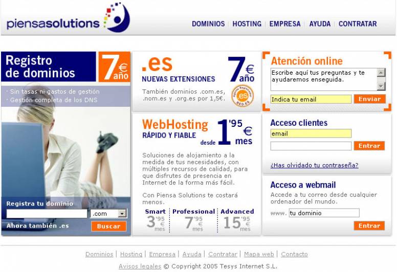 Estrategia: con este proyecto no sólo se ha buscado un cambio de imagen a través del diseño, sino una mejora en la usabilidad y simplicidad para aportar facilidad de uso. Piensa Solutions quería que la agencia Httpcomunicació hiciese más fácil la navegación por su página web, utilizando esta usabilidad para convertir la interacción del usuario en parte de la comunicación. Por otra parte, lo que también pretendían desde la empresa, además de renovar la imagen del site, es que cualquier persona pudiese acceder a un alojamiento en internet, disfrutando de su espacio sin trabas económicas. Httpcomunicació se ha encargado del proyecto web de Piensa Solutions, llevando a cabo el diseño, estudio de consultoría y análisis de arquitectura de la web, así como la realización de diversas piezas de comunicación.Además, la implementación del contenido se realiza bajo un motor de gestión de contenidos administrado por el equipo de Piensa Solutions.
